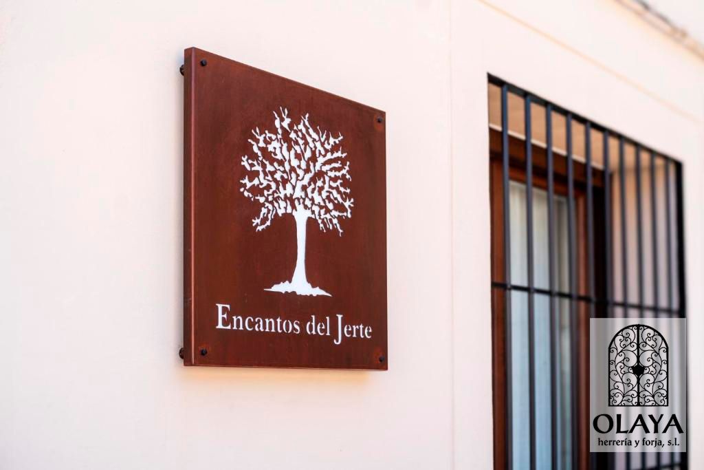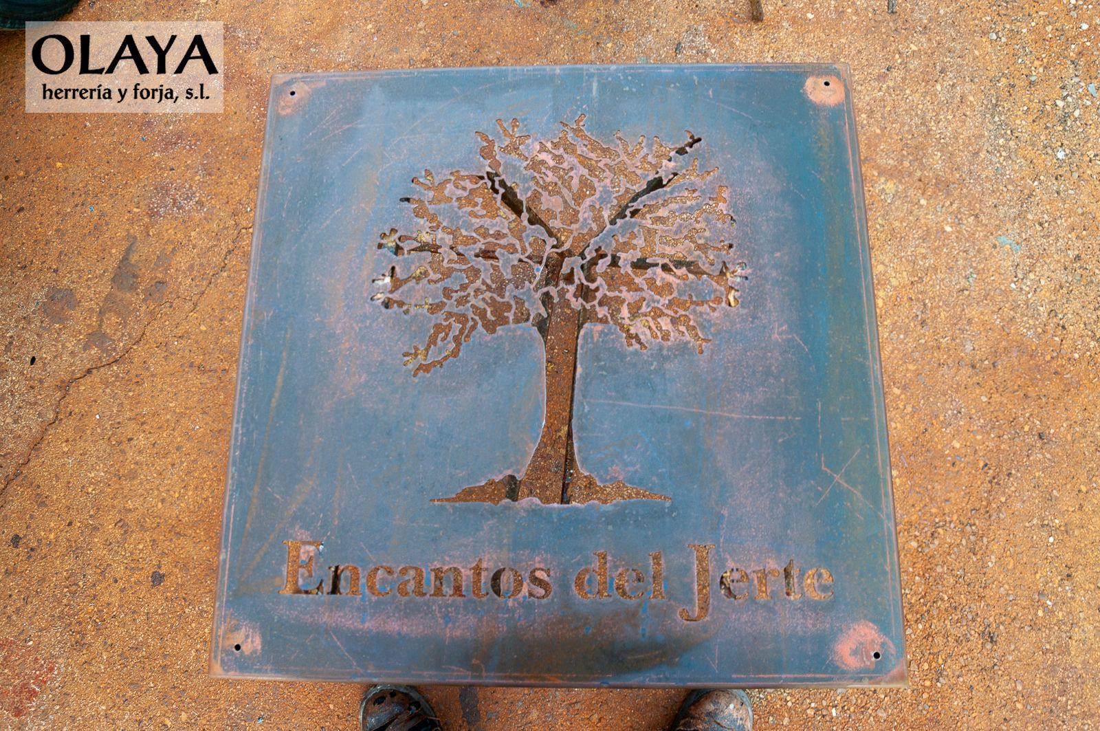 Rótulo Acero Corten Encantos del Jerte. Este espectacular rótulo lo dice todo, la maravilla, el espectáculo de ver los encantos del Jerte en flor. Retroiluminado.