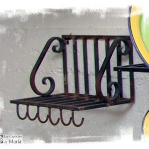 Estantería De Forja dos baldas ganchos, Estantería de forja pintada en color beige, como platero y con ganchos para colgar las tazas o vasos.